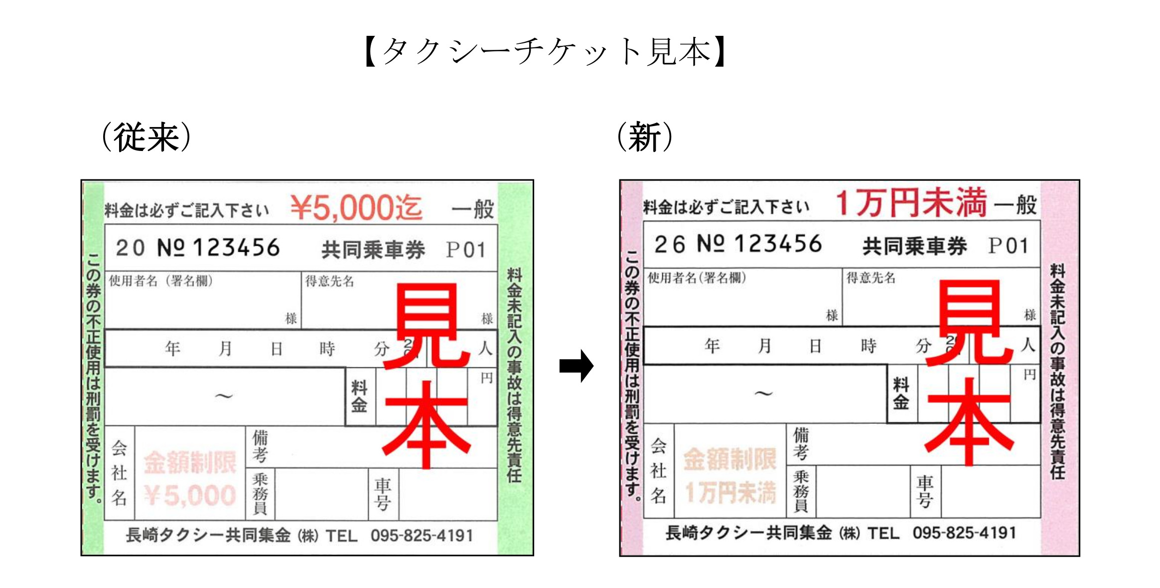 タクシーチケットの改刷に伴い、色および使用限度額を変更いたしました。
